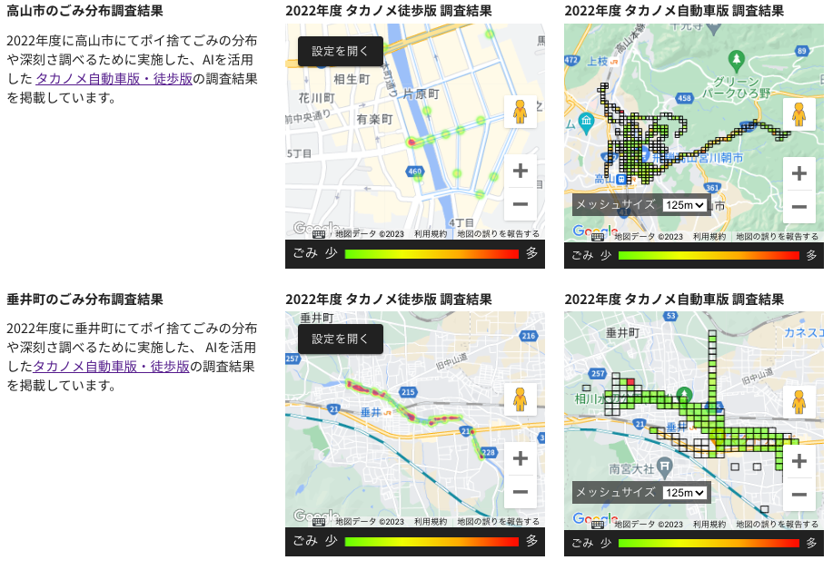 さらに、ごみ分布調査サービス「タカノメ」自動車版を活用し、海洋ごみ対策の重点モデル区域(高山市、垂井町)にて、散乱ごみの分布状況の調査及び分析も行いました。