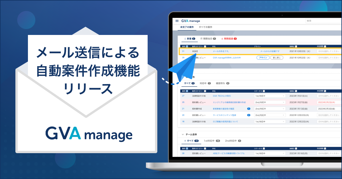 GVA manage(ジーヴァ マネージ)は、契約書の作成・レビューや法律相談などの法務案件を一元管理するクラウドサービスです。法務案件を依頼する事業部担当は専用のアカウントが不要で、普段やりとりに使用しているメールやチャットツールに返答するだけで、法務と事業部間の質疑などメッセージや契約書などの添付ファイルを、GVA manageに集約することができます。法務部は集約されたデータを検索することができ、過去案件の調査に掛ける時間を大幅に削減できます。