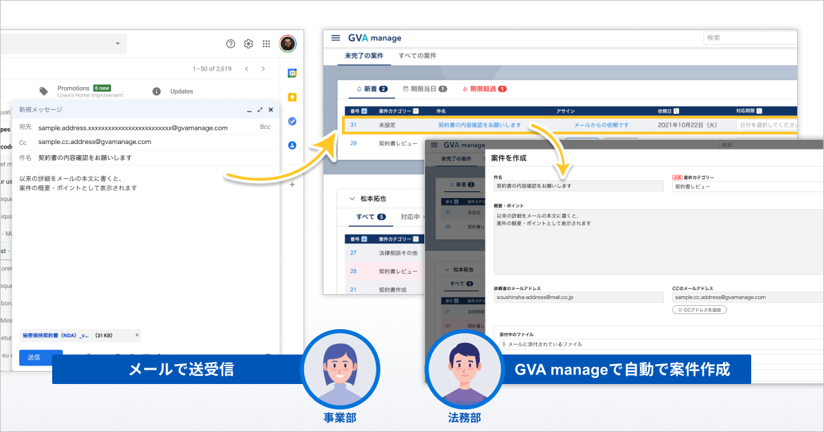 例えば、A事業部の法務案件は法務部員Aが担当であると決まっている場合は、法務部員A専用のGVA manageメールアドレスを用意することで、自動で法務部員Aが担当にアサインされるように設定することができます。