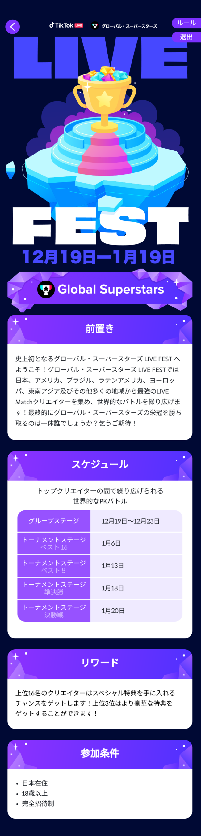 TikTok LIVE Global Superstarsは、2022年12月20日〜2023年1月20日にてTikTok アプリ上にて開催され、日本、アメリカ、ブラジル、ラテンアメリカ、ヨーロッパ、東南アジア及びその他多くの地域から、最強のLIVE Matchクリエイター全48名が参戦してバトルを行い優勝者を決めるイベントです。
