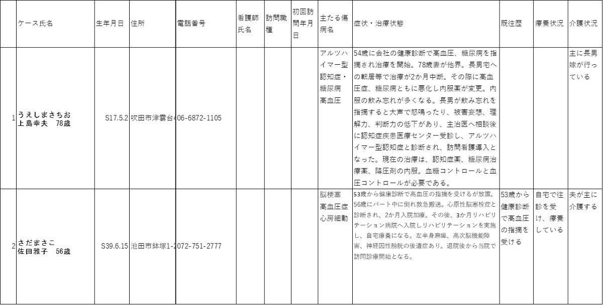 電子カルテを運用する際の入力項目として訪問看護ステーション(以下、ステーション)の情報、利用者の情報、利用者が使用するサービス提供機関やその担当者の情報、訪問看護指示書などがある。例えば、ステーションの情報として施設名やスタッフの情報などがある。施設名は架空の名称を入力し、スタッフの情報は3名の教員を管理者、スタッフとして登録した。また利用者の情報として住所や保険情報などがある。住所はカルテ上で地図を参照できるため、本学の実習施設の住所を入力した。保険情報のうち保険番号など、事例のアセスメントに不要な情報は架空の情報を入力した。また、事例の詳細な情報の入力については、iBowの入力項目の一覧を作成(図1-1、1-2、表1)し、教員間で事例ごとに情報の整合性を確認し、議論、検討しながら作成した事例の情報を完成させた。週の訪問予定は実習施設の多くで行われているように週間予定のホワイトボードを準備した(図2)。