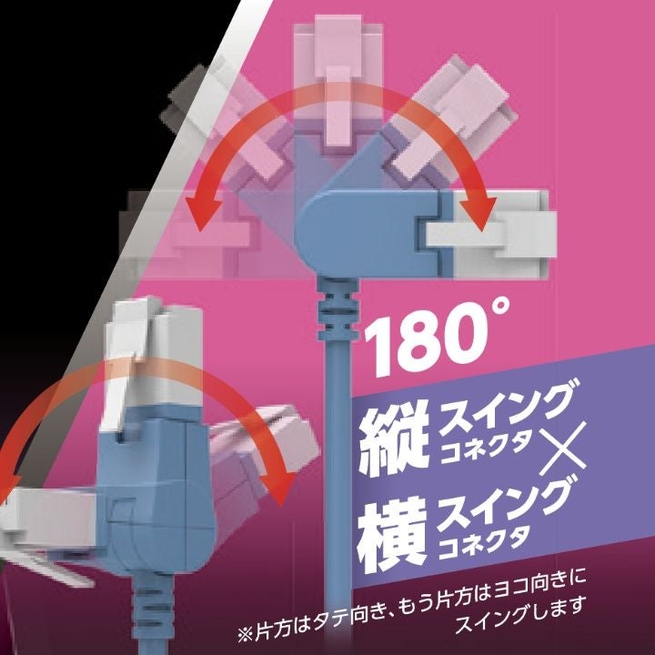 コネクターの向きを調整できるため、パソコンやルーターなどの設置環境に合わせてスッキリ配線することができます。片方のコネクターのみスイングする「縦スイング×ストレートタイプ」と、片方は縦向き、もう片方は横向きにスイングする「縦スイング×横スイング」の2タイプ展開です。
