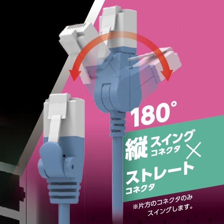 片方のコネクターが垂直方向に上下90度回転、もう片方のコネクターが水平方向に左右90度回転できるスイングコネクターを搭載したLANケーブルです。