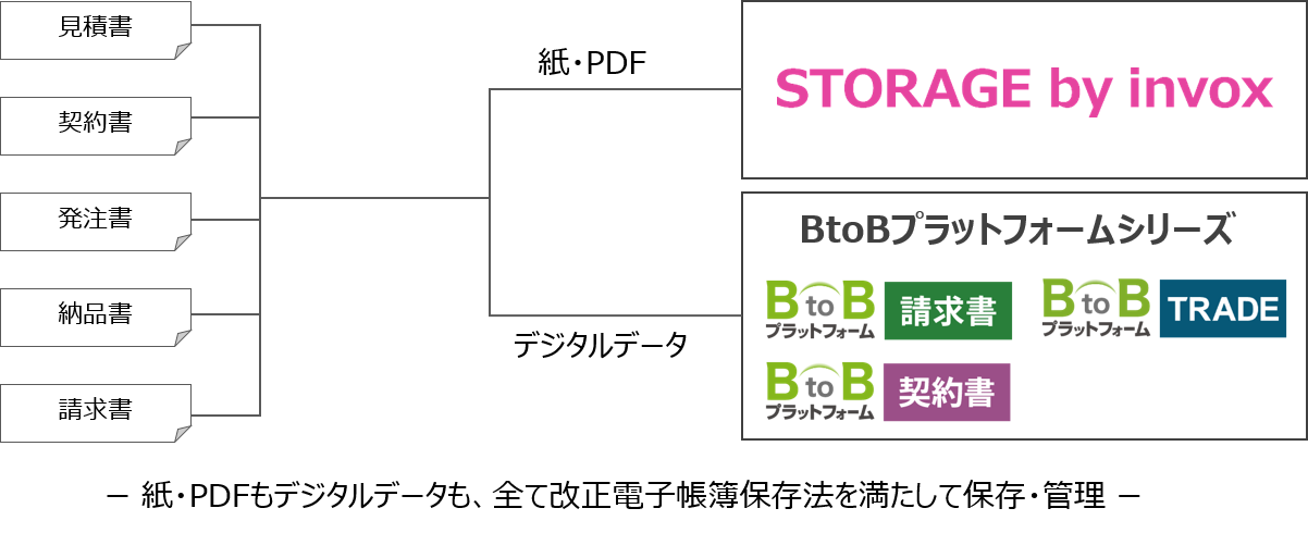 「STORAGE by invox」は、紙やPDFで受け取った請求書や納品書、領収書等の国税関係書類を、検索要件の記録項目として必要な「取引年月日・金額・取引先」を正確にデータ化し、訂正削除の履歴や申請・承認の記録を残して電子保存・管理することができます。これにより、当社のBtoBプラットフォームシリーズとあわせ、ユーザーの幅広い書類の電子保存ニーズに対して対応できるようになります。
