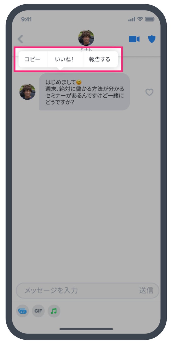 ● 不快なメッセージを受信した場合は、そのメッセージをタップして長押しする「長押しによる報告」を活用して、簡単に報告することができます。