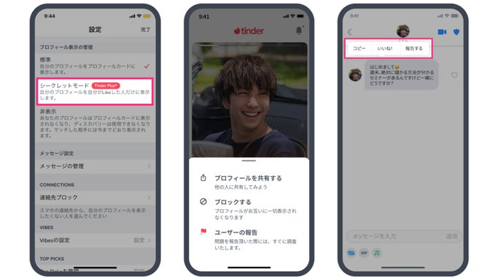 ●セーフティーセンター:https://www.help.tinder.com/hc/ja/articles/360039734112-Tinder