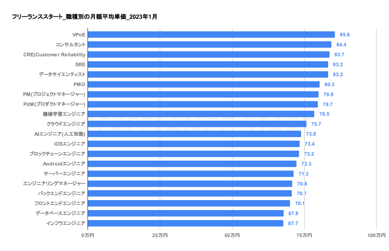具体的な月額平均単価は1位「VPoE」が85.6万円(前月比+22.3万円・35.23%増)、2位「コンサルタント」が84.4万円(同+10.3万円・13.90%増)、3位「CRE(Customer Reliability Engineer)」が83.7万円(同+2.5万円・3.08%増)でした。