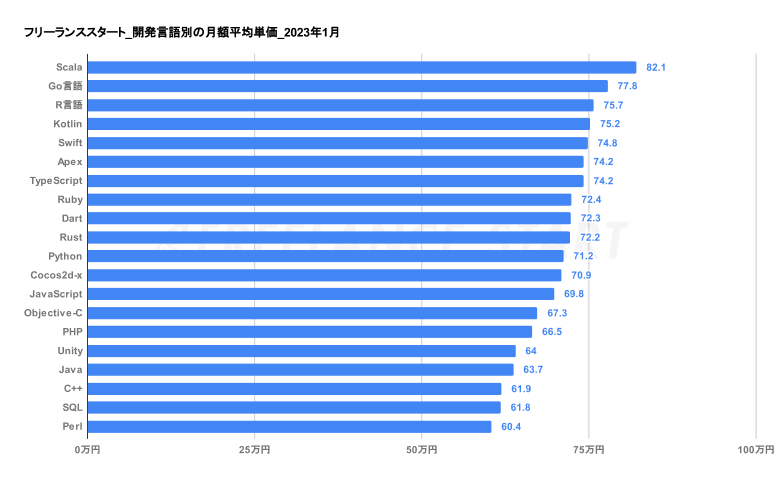 具体的な月額平均単価は1位「Scala」が82.1万円(前月比+6.6万円・8.74%増)、2位「Go言語」が77.8万円(同+12.5万円・19.14%増)、3位「R言語」が75.7万円(同-8.6万円・10.20%減)でした。