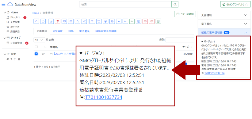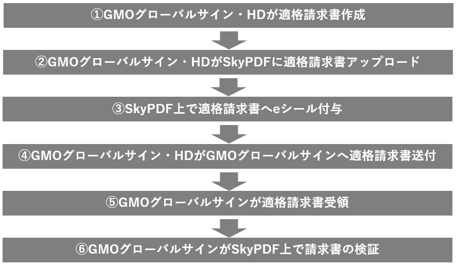 そのため、同年11月には、GMOグローバルサイン・ホールディングス(以下、GMOグローバルサイン・HD)とGMOグローバルサインとの間の取引において「適格請求書」を電子的に発行、テスト版の「eシール」を「SkyPDF」上で付与し、eシール付与済みの適格請求書を「SkyPDF」上で検証するという一連の流れをテストいたしました。