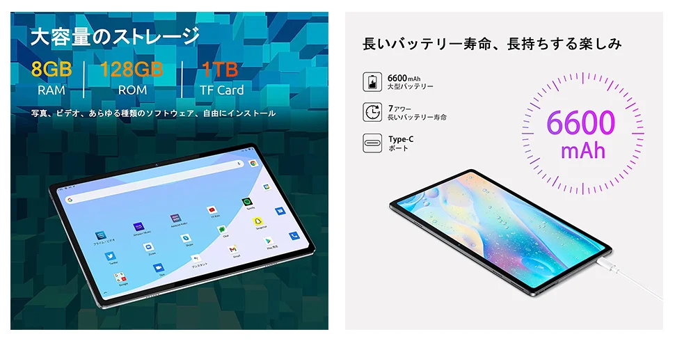 i11タブレットは8GBのランニングメモリーと128GBの高速ストレージスペースを搭載し、より高速でパワフルに。 同時に、MicroSD拡張可能ストレージスペース(SDカードを除く)をサポートし、より多くのスペースをもたらします。 写真、動画、曲、ゲームなど、あらゆるソフトウェアを好きなようにインストールでき、容量不足の問題もなく十分に楽しめます。 6600mahの大容量バッテリーとAIインテリジェント電源管理、最大7時間のビデオ再生時間。