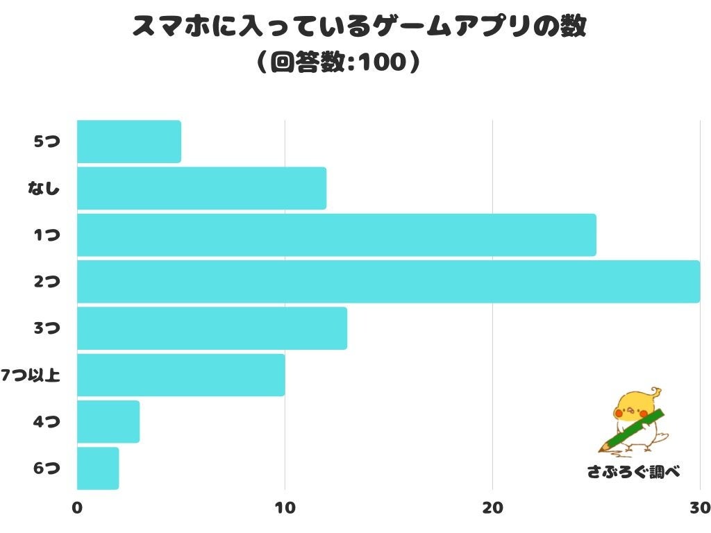 スマホに入っているゲームアプリの数をアンケートにて調査したところ、1位は「2つ」でした。