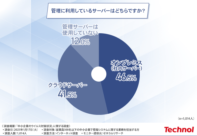 「管理に利用しているサーバーはどちらですか?」と質問したところ、『オンプレミス(社内サーバー)(46.5%)』『クラウドサーバー(41.5%)』『管理サーバーは使用していない(12.0%)』という回答結果になりました。