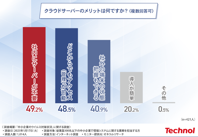先程の質問で『クラウドサーバー』と回答した方に、「クラウドサーバーのメリットは何ですか?(複数回答可)」と質問したところ、『社内にサーバーが不要(49.2%)』と回答した方が最も多く、次いで『どこからでもアクセス(管理)が可能(48.5%)』『社外の端末の状態把握もできる(40.9%)』と続きました。