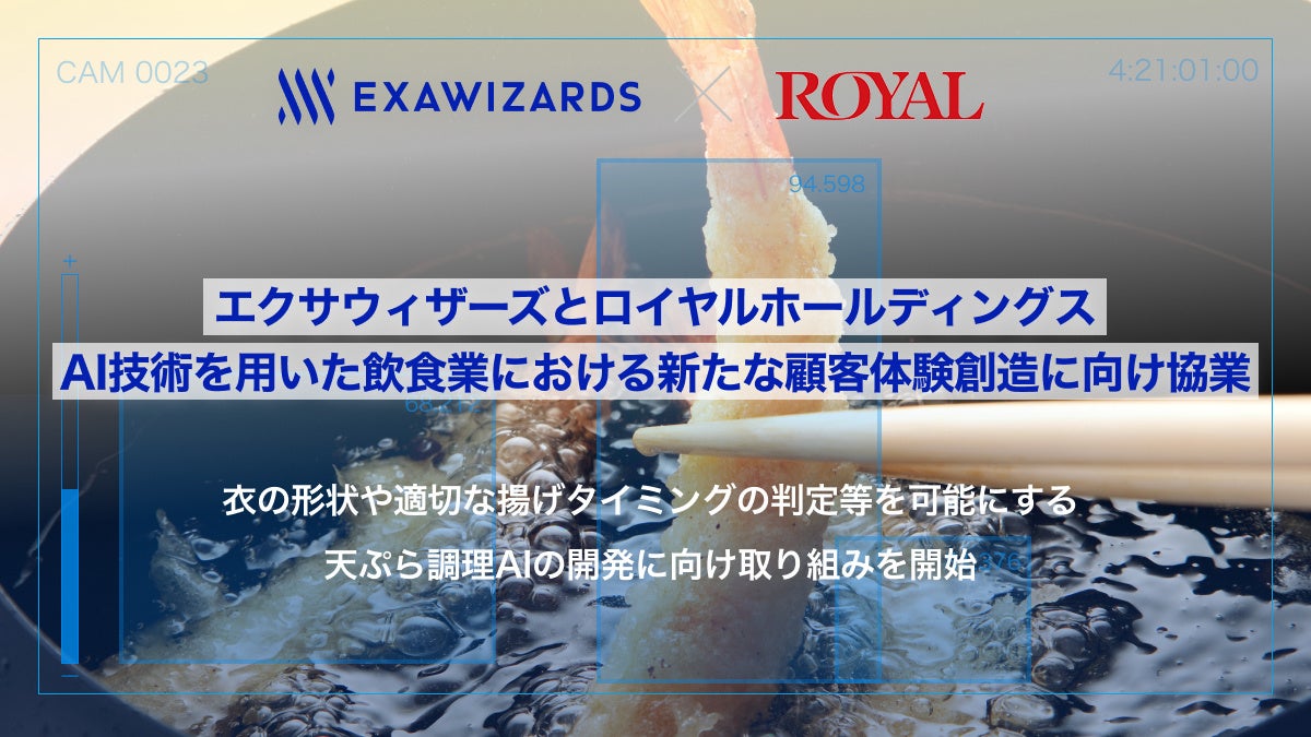 この様な背景から、AIを利活用した課題解決や事業開発において高い技術力と豊富な経験を持つエクサウィザーズと、質の高い“食”&“ホスピタリティ”の提供を通じた飲食事業展開において実績のあるロイヤルホールディングスの強みを掛け合わせることで、顧客がこれまでにない”楽しみ”や”ワクワク感”などの新たな価値を感じることのできる事業開発を行うため、このたび協業を開始しました。