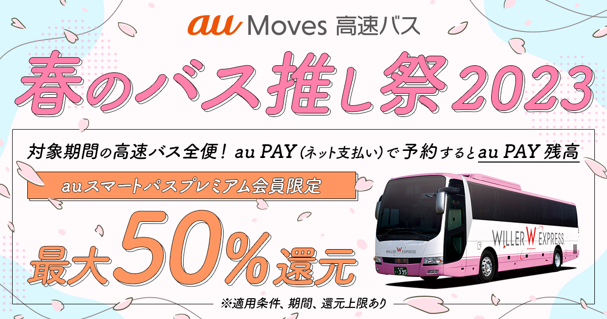 - 概要:「au Moves 高速バス」で対象便のチケットをご購入いただくとチケット購入額の40%をau PAY 残高として還元します。auスマートパスプレミアム会員のお客さまには、還元率をさらに10%上乗せし、チケット購入額の50%をau PAY 残高として還元します。