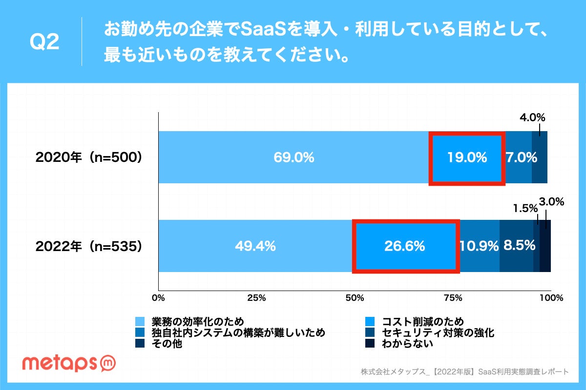 2年前のSaaS導入・利用目的は約7割が「業務効率化」だったのが、2022年では「業務効率化」は半分以下となり、2年前に2割以下だった「コスト削減」が2022年では約3割近くまで伸びました。