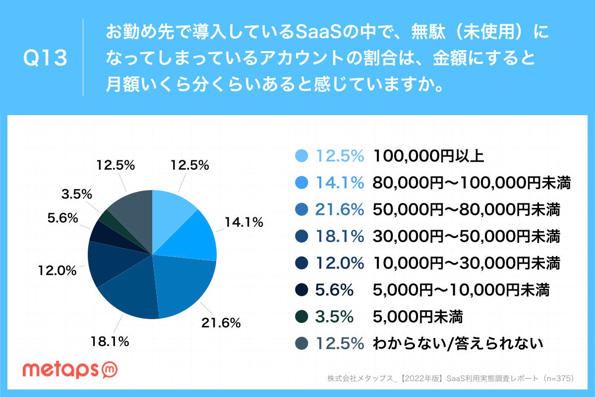 未使用アカウントをコストに換算すると50,000円〜80,000円が21.6%と最も多く、100,000円以上も12.5%となりました。