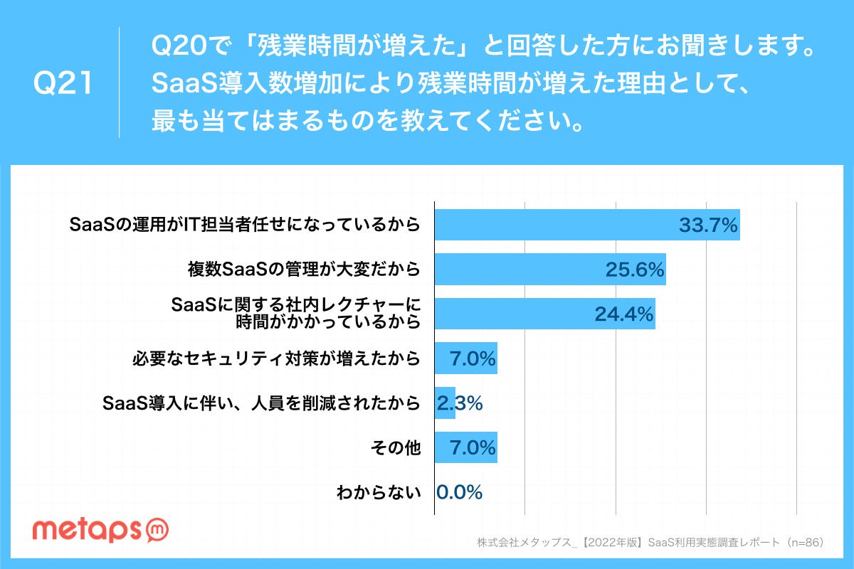 残業時間が増えた理由で最も多かったのが「SaaSの運用がIT担当者任せになっているから」でした。