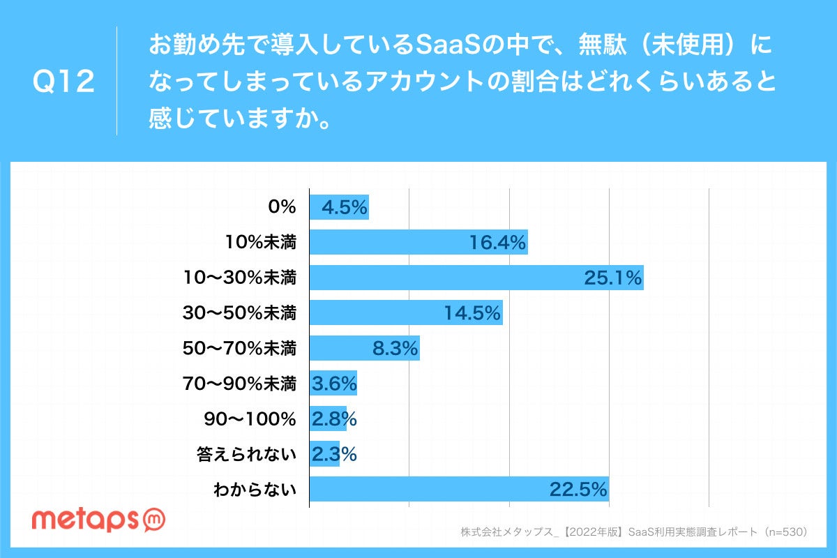 未使用アカウントがないと回答したのは4.5%にとどまり、7割以上は未使用アカウントを保有している結果となりました。また、「わからない」が22.5%となり、アカウントの利用状況が把握できていない(管理できていない)企業が一定数存在することがわかりました。