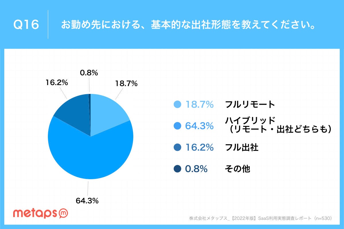 SaaSを導入している企業では、ハイブリッド型(リモートと出社どちらも導入)の企業が過半数を占め、フルリモートを含めると8割以上の企業でリモートワークを導入しています。フル出社は2割以下となり、多くの企業では現在もリモートワークが継続されていることがわかりました。