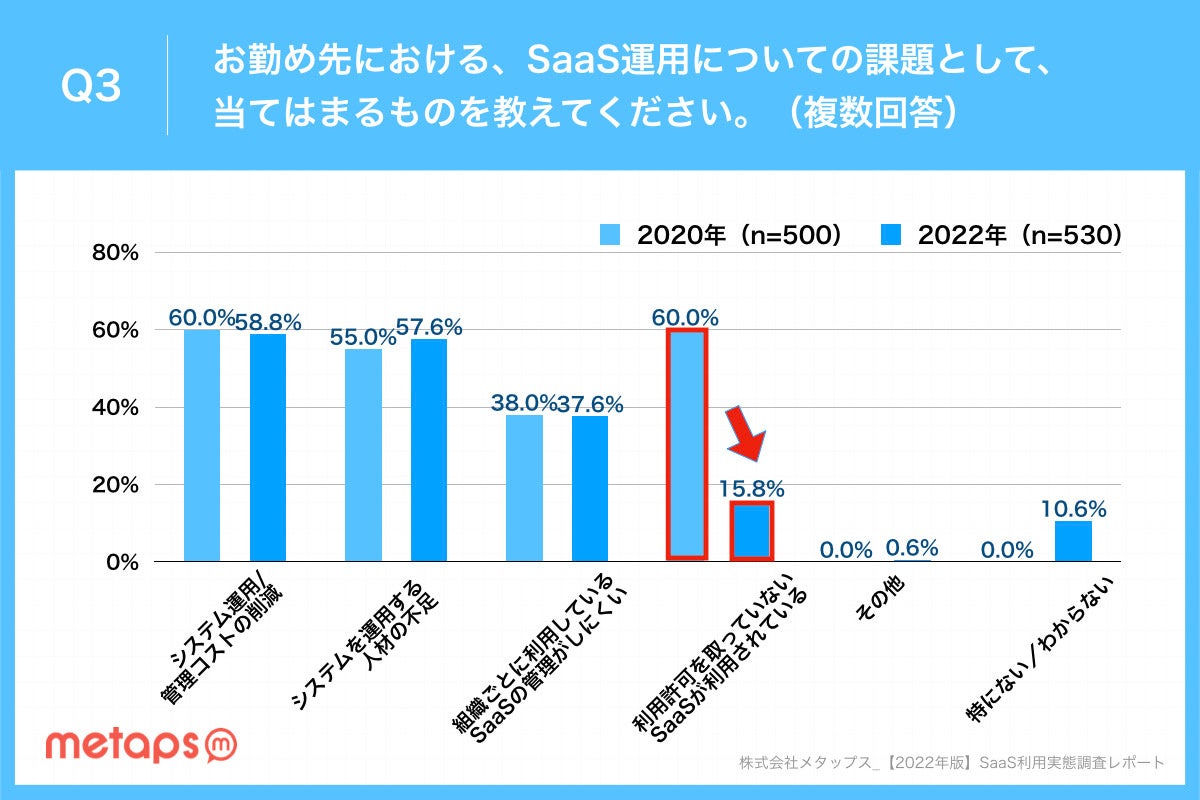 2年前は「利用許可を取っていないSaaSが利用されている」が6割を占めていましたが、2022年には15.8%にまで減少しました。
