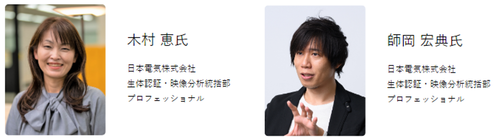 対談 顔・虹彩マルチモーダル生体認証で実現する「自分自身がカギになる、新しい社会」には、NEC 生体認証・映像分析統括部の木村プロフェッショナル、師岡プロフェッショナルが登壇。顔・虹彩マルチモーダル生体認証について、特に、高度なフィジカルセキュリティを求める施設・サービスなどのユースケースや目指す社会を、デモを交えてご紹介します。
