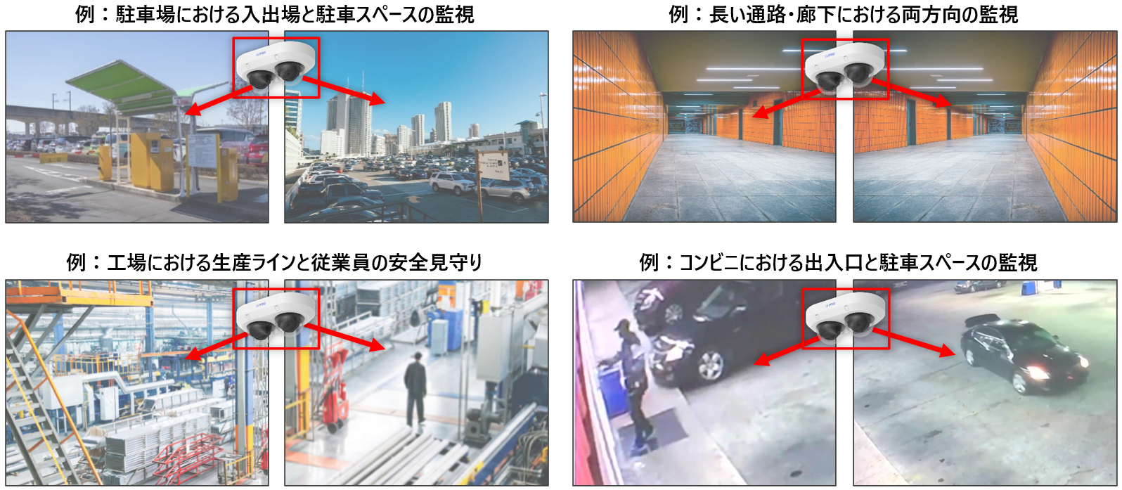 独立して方向調整が可能なカメラユニットを2台搭載し、従来2台のカメラ設置が必要な場所でも1台のカメラで撮影可能なため、省スペース化や導入コストの低減が実現できます。