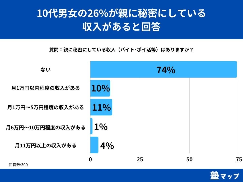 10代の男女を対象とした「親に秘密にしている収入(バイト・ポイ活等)はありますか?」というアンケートで最も多かった回答は「ない」で74%でした。
