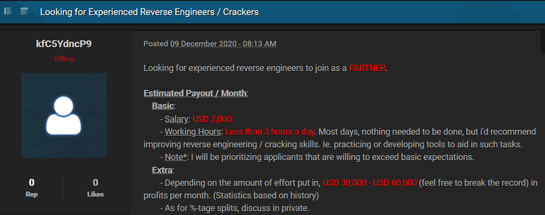 調査で確認した最も高いオファーは開発者の月給2万ドルで、開発者の最低オファーは月給200ドルでした。また、求人の中には、不正侵入した組織から身代金を脅し取った場合、プロジェクトの成功報酬としてボーナスや歩合が支給されるものもありました。
