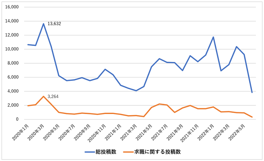 図1:ダークウェブ求人フォーラム投稿数の月別推移(2020年1月~2022年6月)