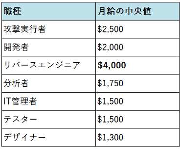 DFIチームは、約20万件の雇用関連の投稿の中で、800以上のIT関連の求人に関してダークウェブでは曖昧になりがちな給与について明記している投稿を160件以上検証しました。その結果、各IT専門職へのオファー金額の中央値は月額1,300~4,000ドルの間でばらつきがあり、最も高い月給の中央値は4,000ドルで、リバースエンジニアの求人でした。