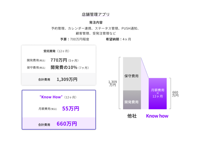 しかし、KNOWHOW開発の場合、開発+保守+機能追加をした上でも1年間の合計費用は660万円に収まります。