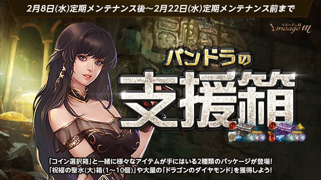 各種コインから任意のアイテムを選択して獲得できる「コイン選択箱」3個や、過去のコレクション登録材料として使用可能な「パンドラのコレクションの欠片」3個と一緒に冒険に役立つアイテムが獲得できる、各種「パンドラの支援箱」が登場しました。