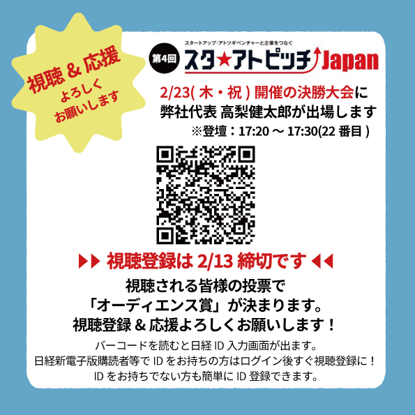 2023年2月23日(木・祝)開催の「第4回スタ★アトピッチJapan」決勝大会に、株式会社wash-plus代表高梨健太郎が出場します。※登壇は17:20~17:30(22番目)