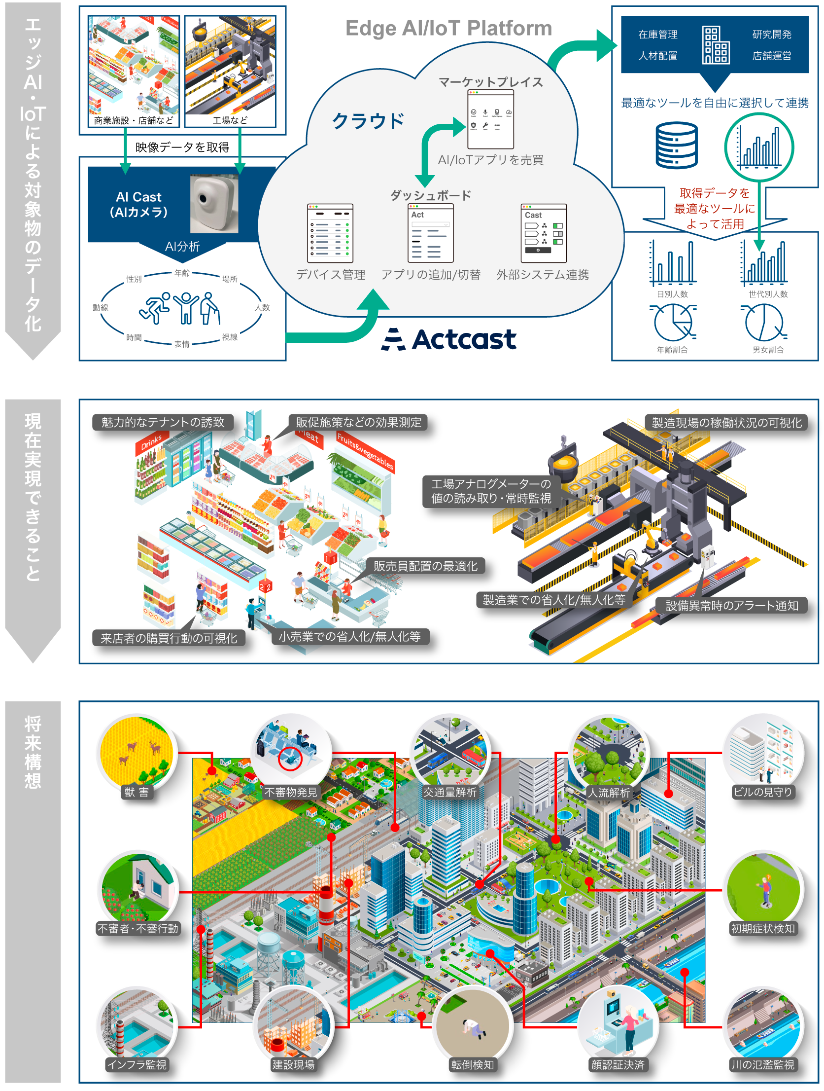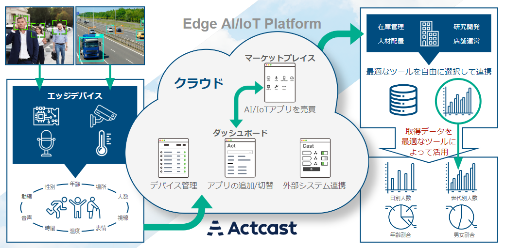 また、AIカメラ導入にあたり主な懸念となるコスト面や個人情報保護についても、従来のクラウドAIカメラと異なり、エッジAIプラットフォーム「Actcast」であればクリアすることができます。