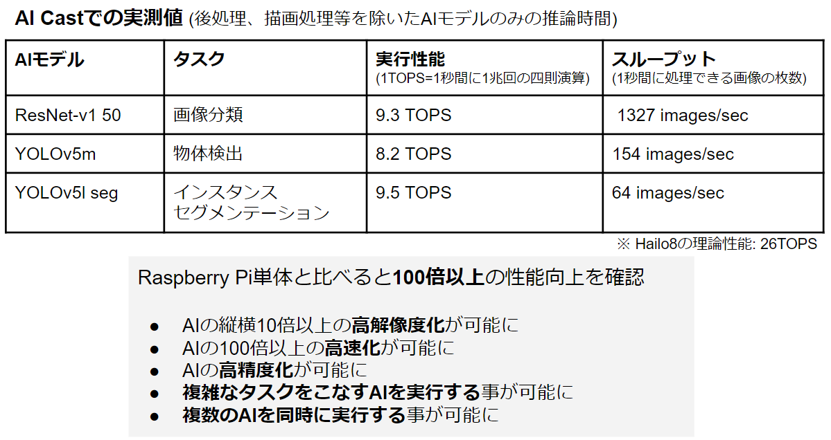 AI Castには汎用コンピュータ「Raspberry Pi(通称:ラズパイ)」に加えてAIアクセラレーターチップ「Hailo-8」が搭載されており、Ideinの得意とする高速化技術と相まって、AIカメラの実測性能100倍以上の向上を実現しました。これにより、顔認証、深度推定、姿勢推定、暗所での分析、属性分析等の大幅な精度向上が見込めます。