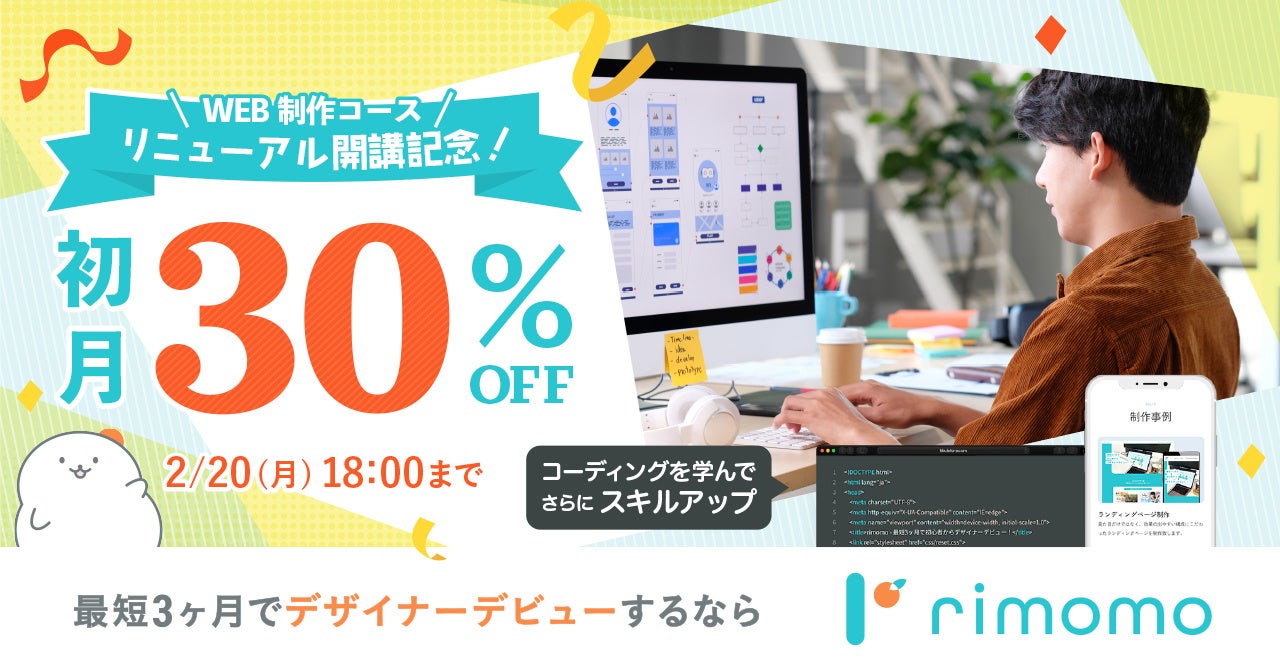 WEB制作コースのリニューアル開講を記念して受講料が初月30%OFFになるキャンペーンを実施中です!