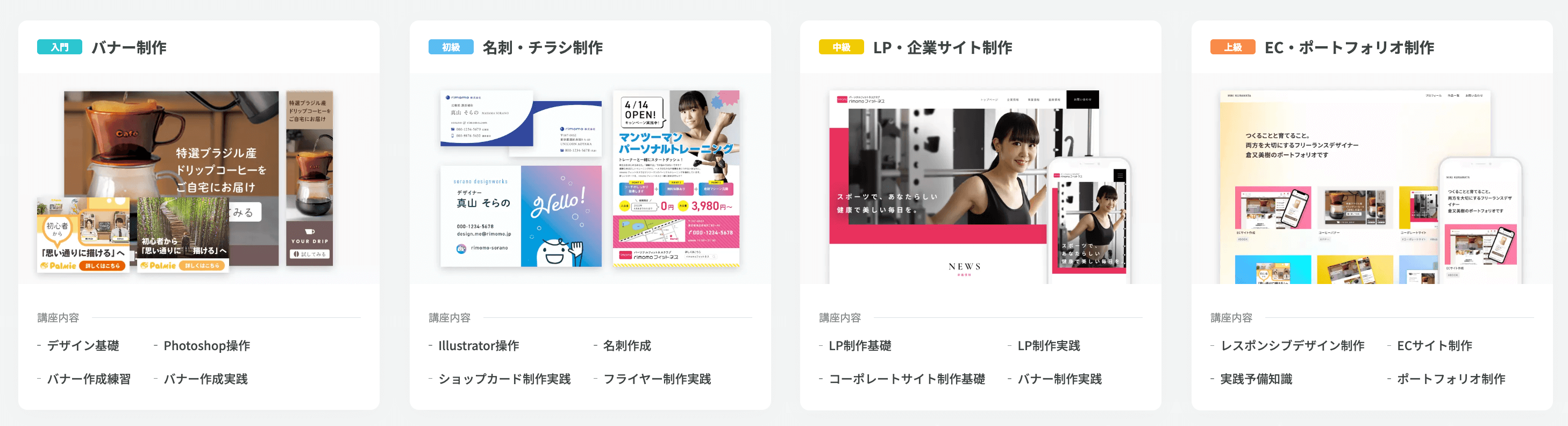 デザインソフトの使い方からWEBバナー・チラシ・名刺・WEBサイトの制作等の実践知識まで幅広く学べるコースです。
