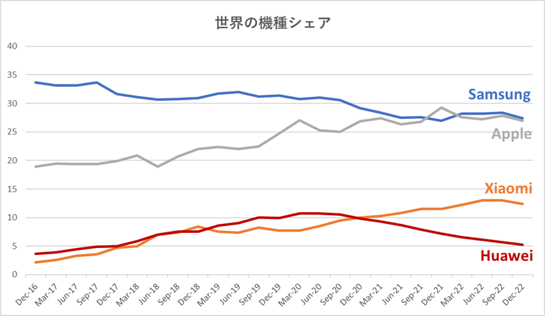 以下のグラフは、2016年12月からの世界のモバイル機種シェアの推移を表したグラフです。前回調査(2022年5月時点)で首位だったAppleは0.63%減少し、Samsungに次いで2位となりました。