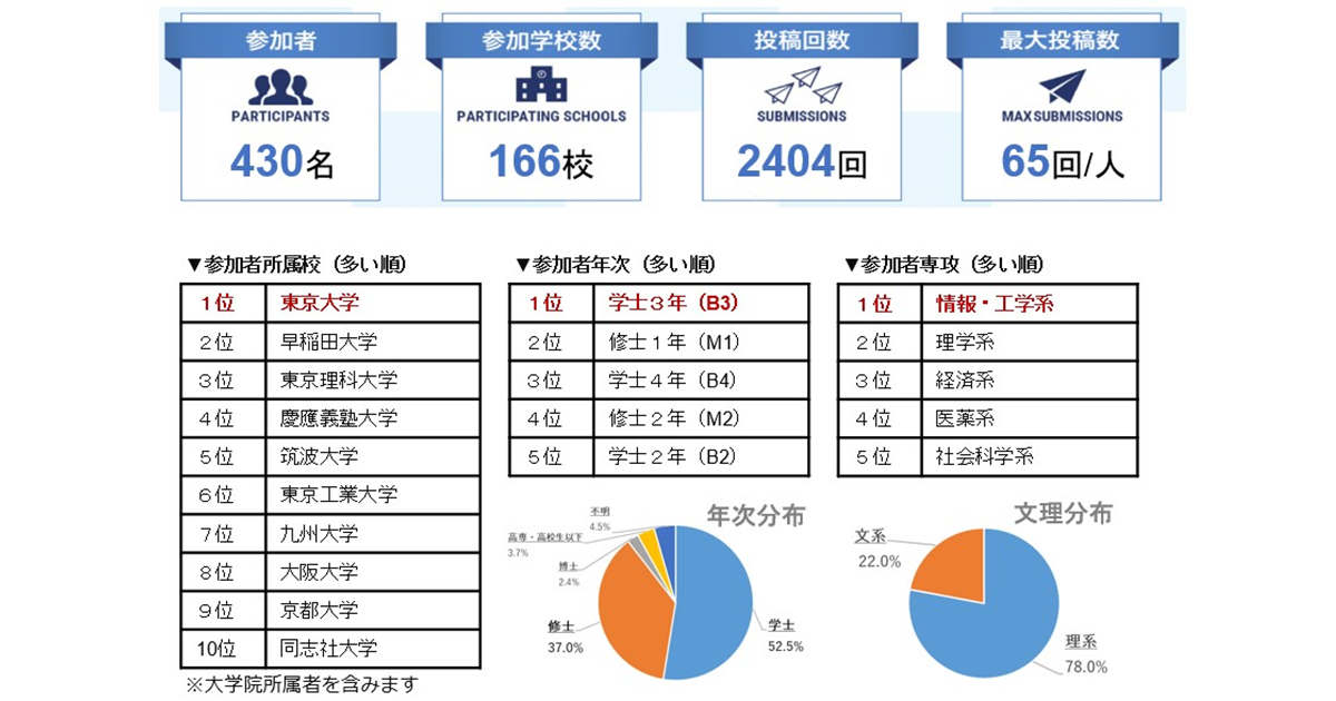 高度なデータ活用スキルを有する学生の発掘・育成を目的に、SIGNATEが企画する学生限定のイベントです。データサイエンスやAIモデリング等の技術・アイデアを競い合うデータ分析コンペ開催に加え、コンペ終了後には企業と学生が集まり入賞者の解法プレゼンや企業からのPRピッチなどを含むアフターイベントを実施。これらを通じ、学生に対してはスキルアップやキャリアを考える機会を、ハイスキル学生採用に力を入れる企業に対しては「出合い」の場を、それぞれ提供しています。