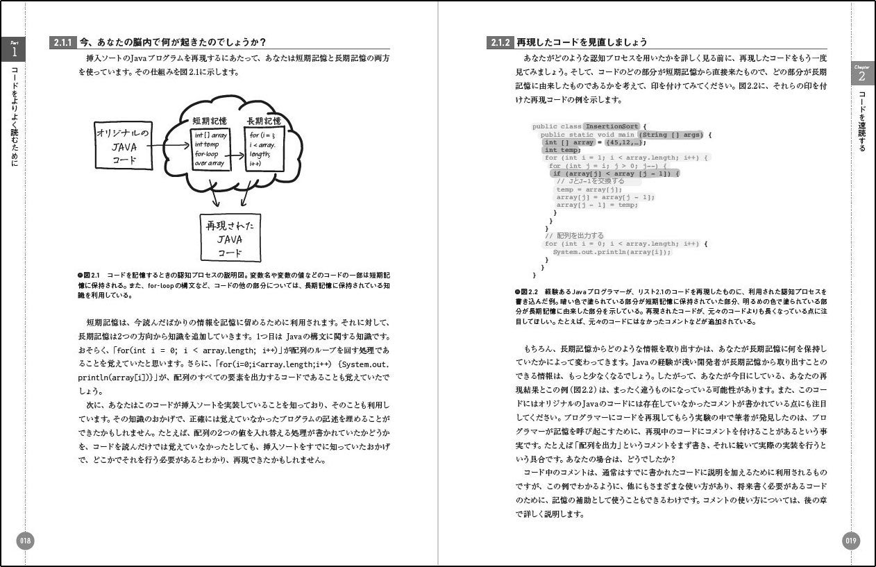 第1部では、認知科学に基づく脳の動きを説明し、それがプログラミングにどのように関連するのかを紹介しています。また、それを踏まえて、職業プログラマーとしてのコードの読み方について考えます。