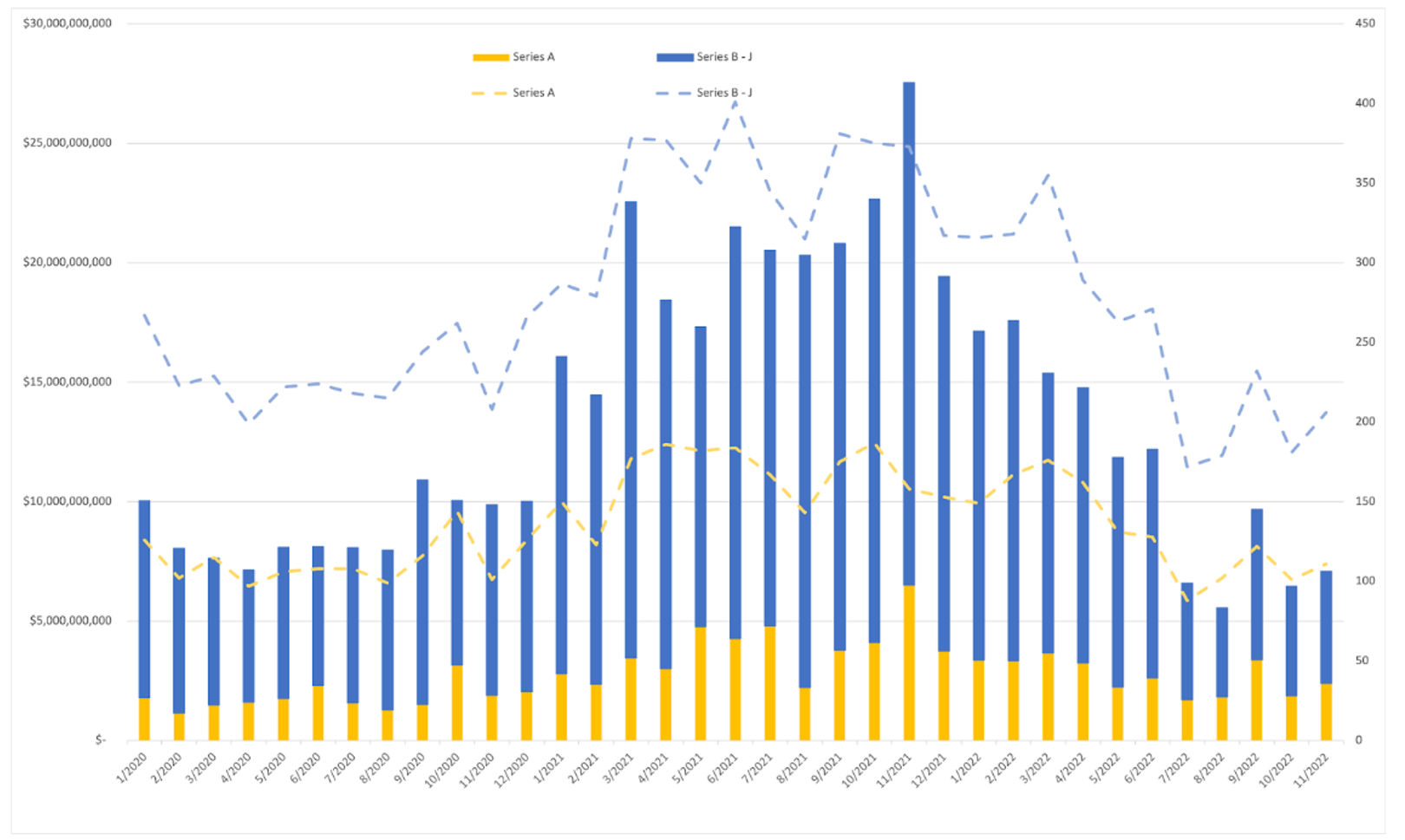 シリーズA・シリーズBへのベンチャー投資動向では、2021年末をピークに現在、ピーク時の3分の1以下で推移しています。