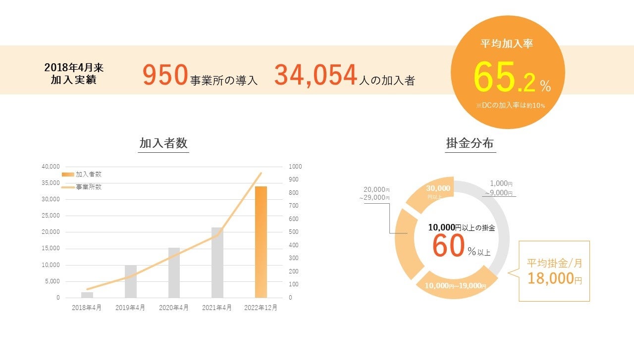 従業員側のメリットには、難しい投資の知識が不要で、元本が保証されていることがあげられます。また、原則60歳以上にならないと受け取りができない企業型DC(企業型確定拠出年金)やiDeCo(個人型確定拠出年金)に比べて、退職時や休職時、育児・介護休業時にも受け取ることが可能なため、育児や介護を将来に控える従業員から厚い支持を集めています。現在、加入事業所のうち73%が医療・福祉関係となっておりますが、他業界の法人様にもご加入いただけます。