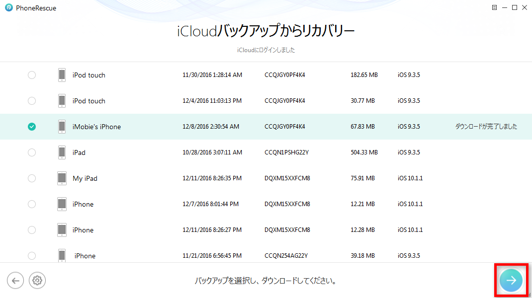 iTunesバックアップ以外、PhoneRescue for iOSでiCloudバックアップから着信履歴だけを復元することもできますから、次の手順に従って操作してください。