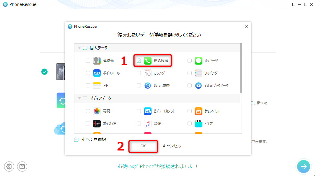 Step 3. 復元したいデータ種類「通話履歴」を選択 > 「OK」ボタンをクリックします。