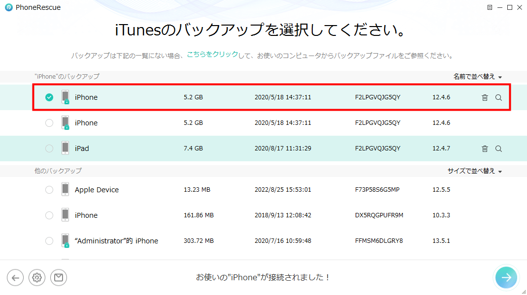 Step 2.接続されたiPhoneのバックアップと他のバックアップが展示されていますから、