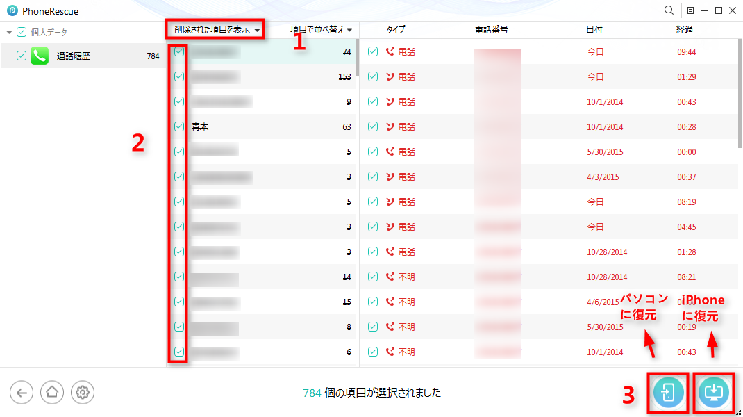 Step 4: 右下の「デバイスへ」&「パソコンへ」ボタンをクリックしてなくなったiPhoneの着信履歴が復元されます。