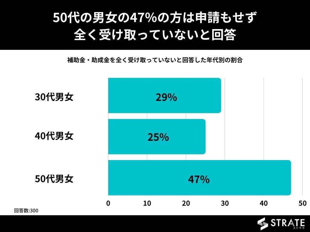 補助金・助成金を全く受け取っていないと回答した割合を年代別でみてみますと、30代男女が29%、40代男女が25%、50代男女が47%という結果になりました。