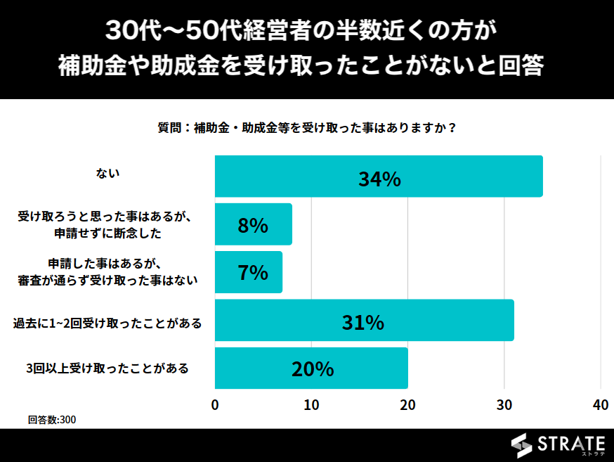 30代~50代経営者・役員の男女を対象とした「補助金・助成金等を受け取った事はありますか?」というアンケートで最も多かった回答は「ない」で34%でした。