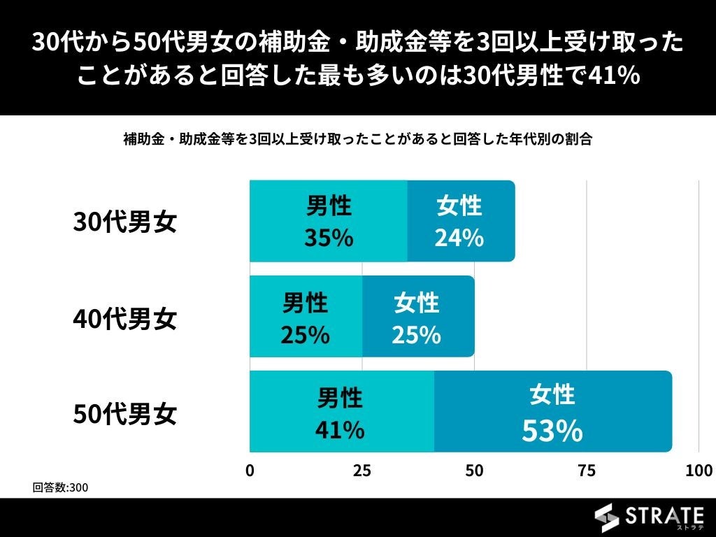 補助金・助成金等を3回以上受けとったことがあると回答した割合を性別別でみてみますと、30代男性が35%、30代女性が24%、40代男性が25%、40代女性が25%、50代男性が41%、50代女性が53%という結果になりました。